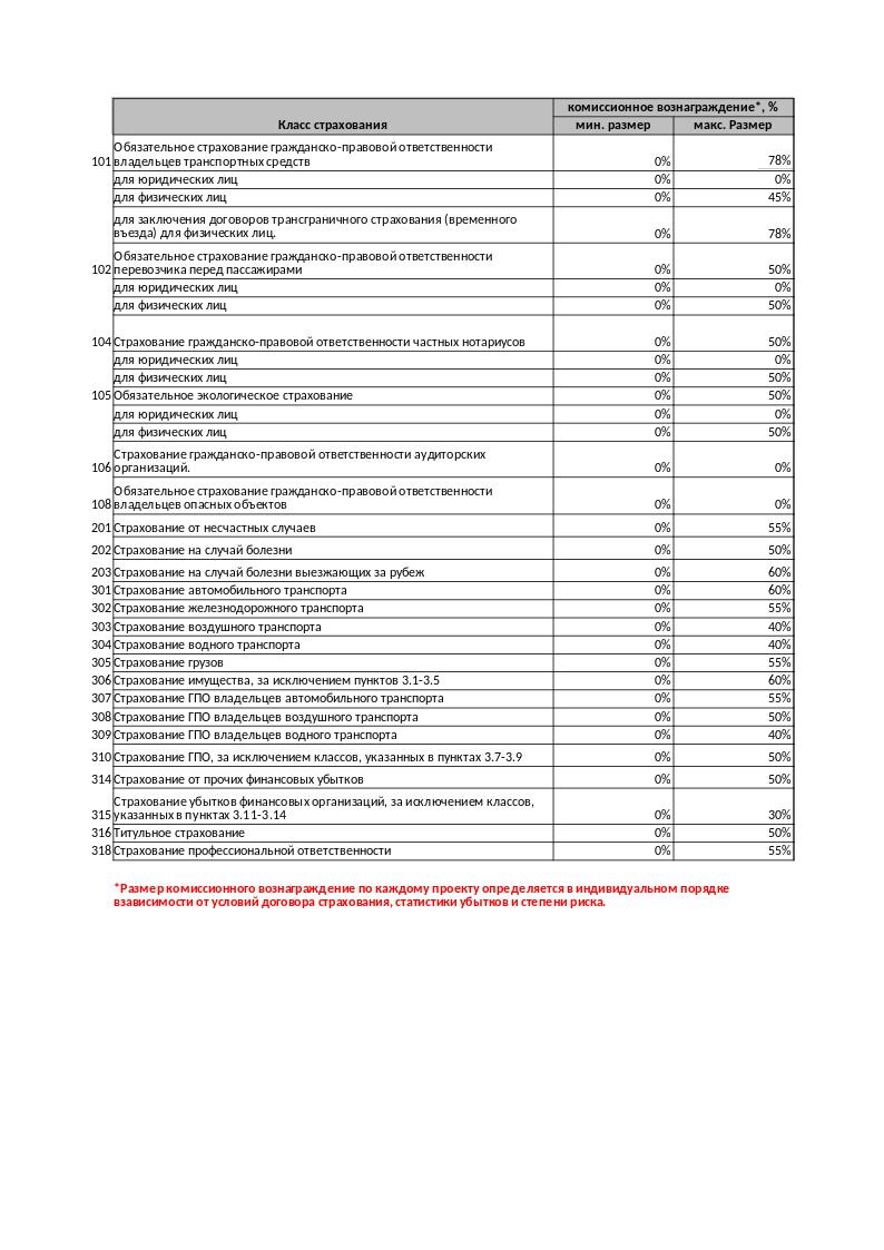 | *Размер комиссионного вознаграждение по каждому проекту определяется в индивидуальном порядке взависимости от условий договора страхования, статистики убытков и степени риска. | |||